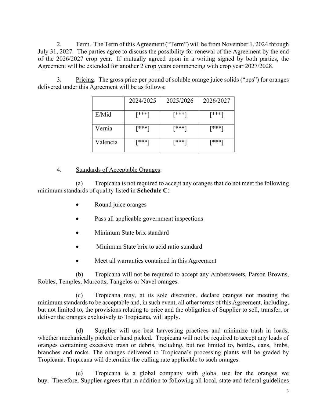 3 2. Term. The Term of this Agreement (“Term”) will be from November 1, 2024 through July 31, 2027. The parties agree to discuss the possibility for renewal of the Agreement by the end of the 2026/2027 crop year. If mutually agreed upon in a writing signed by both parties, the Agreement will be extended for another 2 crop years commencing with crop year 2027/2028. 3. Pricing. The gross price per pound of soluble orange juice solids (“pps”) for oranges delivered under this Agreement will be as follows: 2024/2025 2025/2026 2026/2027 E/Mid [***] [***] [***] Vernia [***] [***] [***] Valencia [***] [***] [***] 4. Standards of Acceptable Oranges: (a) Tropicana is not required to accept any oranges that do not meet the following minimum standards of quality listed in Schedule C: • Round juice oranges • Pass all applicable government inspections • Minimum State brix standard • Minimum State brix to acid ratio standard • Meet all warranties contained in this Agreement (b) Tropicana will not be required to accept any Ambersweets, Parson Browns, Robles, Temples, Murcotts, Tangelos or Navel oranges. (c) Tropicana may, at its sole discretion, declare oranges not meeting the minimum standards to be acceptable and, in such event, all other terms of this Agreement, including, but not limited to, the provisions relating to price and the obligation of Supplier to sell, transfer, or deliver the oranges exclusively to Tropicana, will apply. (d) Supplier will use best harvesting practices and minimize trash in loads, whether mechanically picked or hand picked. Tropicana will not be required to accept any loads of oranges containing excessive trash or debris, including, but not limited to, bottles, cans, limbs, branches and rocks. The oranges delivered to Tropicana’s processing plants will be graded by Tropicana. Tropicana will determine the culling rate applicable to such oranges. (e) Tropicana is a global company with global use for the oranges we buy. Therefore, Supplier agrees that in addition to following all local, state and federal guidelines