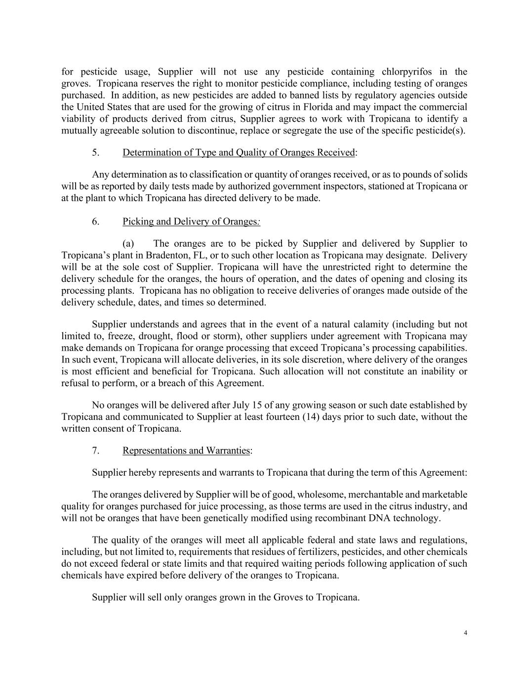 4 for pesticide usage, Supplier will not use any pesticide containing chlorpyrifos in the groves. Tropicana reserves the right to monitor pesticide compliance, including testing of oranges purchased. In addition, as new pesticides are added to banned lists by regulatory agencies outside the United States that are used for the growing of citrus in Florida and may impact the commercial viability of products derived from citrus, Supplier agrees to work with Tropicana to identify a mutually agreeable solution to discontinue, replace or segregate the use of the specific pesticide(s). 5. Determination of Type and Quality of Oranges Received: Any determination as to classification or quantity of oranges received, or as to pounds of solids will be as reported by daily tests made by authorized government inspectors, stationed at Tropicana or at the plant to which Tropicana has directed delivery to be made. 6. Picking and Delivery of Oranges: (a) The oranges are to be picked by Supplier and delivered by Supplier to Tropicana’s plant in Bradenton, FL, or to such other location as Tropicana may designate. Delivery will be at the sole cost of Supplier. Tropicana will have the unrestricted right to determine the delivery schedule for the oranges, the hours of operation, and the dates of opening and closing its processing plants. Tropicana has no obligation to receive deliveries of oranges made outside of the delivery schedule, dates, and times so determined. Supplier understands and agrees that in the event of a natural calamity (including but not limited to, freeze, drought, flood or storm), other suppliers under agreement with Tropicana may make demands on Tropicana for orange processing that exceed Tropicana’s processing capabilities. In such event, Tropicana will allocate deliveries, in its sole discretion, where delivery of the oranges is most efficient and beneficial for Tropicana. Such allocation will not constitute an inability or refusal to perform, or a breach of this Agreement. No oranges will be delivered after July 15 of any growing season or such date established by Tropicana and communicated to Supplier at least fourteen (14) days prior to such date, without the written consent of Tropicana. 7. Representations and Warranties: Supplier hereby represents and warrants to Tropicana that during the term of this Agreement: The oranges delivered by Supplier will be of good, wholesome, merchantable and marketable quality for oranges purchased for juice processing, as those terms are used in the citrus industry, and will not be oranges that have been genetically modified using recombinant DNA technology. The quality of the oranges will meet all applicable federal and state laws and regulations, including, but not limited to, requirements that residues of fertilizers, pesticides, and other chemicals do not exceed federal or state limits and that required waiting periods following application of such chemicals have expired before delivery of the oranges to Tropicana. Supplier will sell only oranges grown in the Groves to Tropicana.