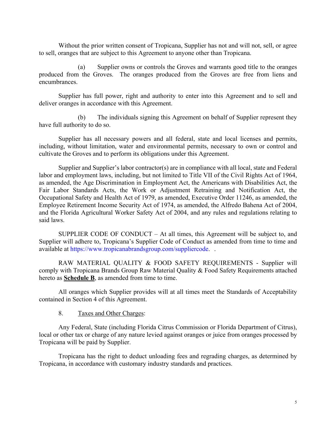 5 Without the prior written consent of Tropicana, Supplier has not and will not, sell, or agree to sell, oranges that are subject to this Agreement to anyone other than Tropicana. (a) Supplier owns or controls the Groves and warrants good title to the oranges produced from the Groves. The oranges produced from the Groves are free from liens and encumbrances. Supplier has full power, right and authority to enter into this Agreement and to sell and deliver oranges in accordance with this Agreement. (b) The individuals signing this Agreement on behalf of Supplier represent they have full authority to do so. Supplier has all necessary powers and all federal, state and local licenses and permits, including, without limitation, water and environmental permits, necessary to own or control and cultivate the Groves and to perform its obligations under this Agreement. Supplier and Supplier’s labor contractor(s) are in compliance with all local, state and Federal labor and employment laws, including, but not limited to Title VII of the Civil Rights Act of 1964, as amended, the Age Discrimination in Employment Act, the Americans with Disabilities Act, the Fair Labor Standards Acts, the Work or Adjustment Retraining and Notification Act, the Occupational Safety and Health Act of 1979, as amended, Executive Order 11246, as amended, the Employee Retirement Income Security Act of 1974, as amended, the Alfredo Bahena Act of 2004, and the Florida Agricultural Worker Safety Act of 2004, and any rules and regulations relating to said laws. SUPPLIER CODE OF CONDUCT – At all times, this Agreement will be subject to, and Supplier will adhere to, Tropicana’s Supplier Code of Conduct as amended from time to time and available at https://www.tropicanabrandsgroup.com/suppliercode. . RAW MATERIAL QUALITY & FOOD SAFETY REQUIREMENTS - Supplier will comply with Tropicana Brands Group Raw Material Quality & Food Safety Requirements attached hereto as Schedule B, as amended from time to time. All oranges which Supplier provides will at all times meet the Standards of Acceptability contained in Section 4 of this Agreement. 8. Taxes and Other Charges: Any Federal, State (including Florida Citrus Commission or Florida Department of Citrus), local or other tax or charge of any nature levied against oranges or juice from oranges processed by Tropicana will be paid by Supplier. Tropicana has the right to deduct unloading fees and regrading charges, as determined by Tropicana, in accordance with customary industry standards and practices.