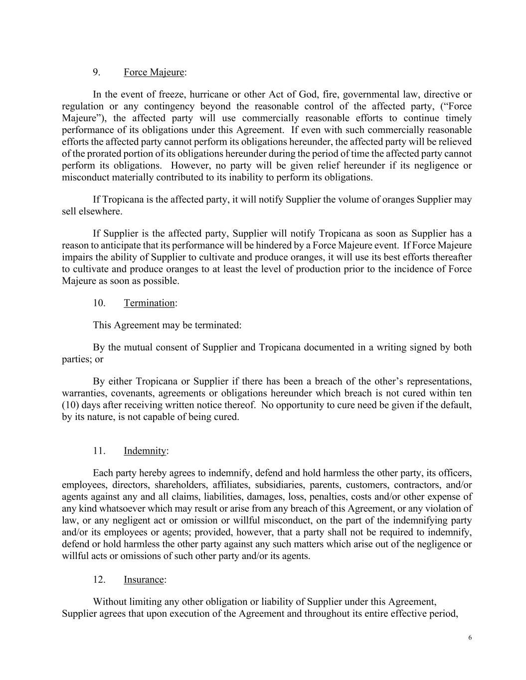 6 9. Force Majeure: In the event of freeze, hurricane or other Act of God, fire, governmental law, directive or regulation or any contingency beyond the reasonable control of the affected party, (“Force Majeure”), the affected party will use commercially reasonable efforts to continue timely performance of its obligations under this Agreement. If even with such commercially reasonable efforts the affected party cannot perform its obligations hereunder, the affected party will be relieved of the prorated portion of its obligations hereunder during the period of time the affected party cannot perform its obligations. However, no party will be given relief hereunder if its negligence or misconduct materially contributed to its inability to perform its obligations. If Tropicana is the affected party, it will notify Supplier the volume of oranges Supplier may sell elsewhere. If Supplier is the affected party, Supplier will notify Tropicana as soon as Supplier has a reason to anticipate that its performance will be hindered by a Force Majeure event. If Force Majeure impairs the ability of Supplier to cultivate and produce oranges, it will use its best efforts thereafter to cultivate and produce oranges to at least the level of production prior to the incidence of Force Majeure as soon as possible. 10. Termination: This Agreement may be terminated: By the mutual consent of Supplier and Tropicana documented in a writing signed by both parties; or By either Tropicana or Supplier if there has been a breach of the other’s representations, warranties, covenants, agreements or obligations hereunder which breach is not cured within ten (10) days after receiving written notice thereof. No opportunity to cure need be given if the default, by its nature, is not capable of being cured. 11. Indemnity: Each party hereby agrees to indemnify, defend and hold harmless the other party, its officers, employees, directors, shareholders, affiliates, subsidiaries, parents, customers, contractors, and/or agents against any and all claims, liabilities, damages, loss, penalties, costs and/or other expense of any kind whatsoever which may result or arise from any breach of this Agreement, or any violation of law, or any negligent act or omission or willful misconduct, on the part of the indemnifying party and/or its employees or agents; provided, however, that a party shall not be required to indemnify, defend or hold harmless the other party against any such matters which arise out of the negligence or willful acts or omissions of such other party and/or its agents. 12. Insurance: Without limiting any other obligation or liability of Supplier under this Agreement, Supplier agrees that upon execution of the Agreement and throughout its entire effective period,