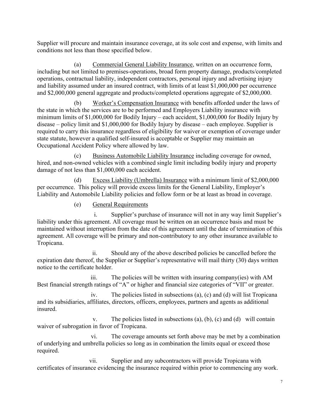7 Supplier will procure and maintain insurance coverage, at its sole cost and expense, with limits and conditions not less than those specified below. (a) Commercial General Liability Insurance, written on an occurrence form, including but not limited to premises-operations, broad form property damage, products/completed operations, contractual liability, independent contractors, personal injury and advertising injury and liability assumed under an insured contract, with limits of at least $1,000,000 per occurrence and $2,000,000 general aggregate and products/completed operations aggregate of $2,000,000. (b) Worker’s Compensation Insurance with benefits afforded under the laws of the state in which the services are to be performed and Employers Liability insurance with minimum limits of $1,000,000 for Bodily Injury – each accident, $1,000,000 for Bodily Injury by disease – policy limit and $1,000,000 for Bodily Injury by disease – each employee. Supplier is required to carry this insurance regardless of eligibility for waiver or exemption of coverage under state statute, however a qualified self-insured is acceptable or Supplier may maintain an Occupational Accident Policy where allowed by law. (c) Business Automobile Liability Insurance including coverage for owned, hired, and non-owned vehicles with a combined single limit including bodily injury and property damage of not less than $1,000,000 each accident. (d) Excess Liability (Umbrella) Insurance with a minimum limit of $2,000,000 per occurrence. This policy will provide excess limits for the General Liability, Employer’s Liability and Automobile Liability policies and follow form or be at least as broad in coverage. (e) General Requirements i. Supplier’s purchase of insurance will not in any way limit Supplier’s liability under this agreement. All coverage must be written on an occurrence basis and must be maintained without interruption from the date of this agreement until the date of termination of this agreement. All coverage will be primary and non-contributory to any other insurance available to Tropicana. ii. Should any of the above described policies be cancelled before the expiration date thereof, the Supplier or Supplier’s representative will mail thirty (30) days written notice to the certificate holder. iii. The policies will be written with insuring company(ies) with AM Best financial strength ratings of “A” or higher and financial size categories of “VII” or greater. iv. The policies listed in subsections (a), (c) and (d) will list Tropicana and its subsidiaries, affiliates, directors, officers, employees, partners and agents as additional insured. v. The policies listed in subsections (a), (b), (c) and (d) will contain waiver of subrogation in favor of Tropicana. vi. The coverage amounts set forth above may be met by a combination of underlying and umbrella policies so long as in combination the limits equal or exceed those required. vii. Supplier and any subcontractors will provide Tropicana with certificates of insurance evidencing the insurance required within prior to commencing any work.