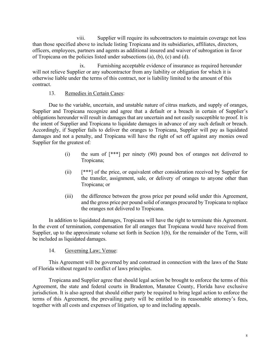 8 viii. Supplier will require its subcontractors to maintain coverage not less than those specified above to include listing Tropicana and its subsidiaries, affiliates, directors, officers, employees, partners and agents as additional insured and waiver of subrogation in favor of Tropicana on the policies listed under subsections (a), (b), (c) and (d). ix. Furnishing acceptable evidence of insurance as required hereunder will not relieve Supplier or any subcontractor from any liability or obligation for which it is otherwise liable under the terms of this contract, nor is liability limited to the amount of this contract. 13. Remedies in Certain Cases: Due to the variable, uncertain, and unstable nature of citrus markets, and supply of oranges, Supplier and Tropicana recognize and agree that a default or a breach in certain of Supplier’s obligations hereunder will result in damages that are uncertain and not easily susceptible to proof. It is the intent of Supplier and Tropicana to liquidate damages in advance of any such default or breach. Accordingly, if Supplier fails to deliver the oranges to Tropicana, Supplier will pay as liquidated damages and not a penalty, and Tropicana will have the right of set off against any monies owed Supplier for the greatest of: (i) the sum of [***] per ninety (90) pound box of oranges not delivered to Tropicana; (ii) [***] of the price, or equivalent other consideration received by Supplier for the transfer, assignment, sale, or delivery of oranges to anyone other than Tropicana; or (iii) the difference between the gross price per pound solid under this Agreement, and the gross price per pound solid of oranges procured by Tropicana to replace the oranges not delivered to Tropicana. In addition to liquidated damages, Tropicana will have the right to terminate this Agreement. In the event of termination, compensation for all oranges that Tropicana would have received from Supplier, up to the approximate volume set forth in Section 1(b), for the remainder of the Term, will be included as liquidated damages. 14. Governing Law; Venue: This Agreement will be governed by and construed in connection with the laws of the State of Florida without regard to conflict of laws principles. Tropicana and Supplier agree that should legal action be brought to enforce the terms of this Agreement, the state and federal courts in Bradenton, Manatee County, Florida have exclusive jurisdiction. It is also agreed that should either party be required to bring legal action to enforce the terms of this Agreement, the prevailing party will be entitled to its reasonable attorney’s fees, together with all costs and expenses of litigation, up to and including appeals.