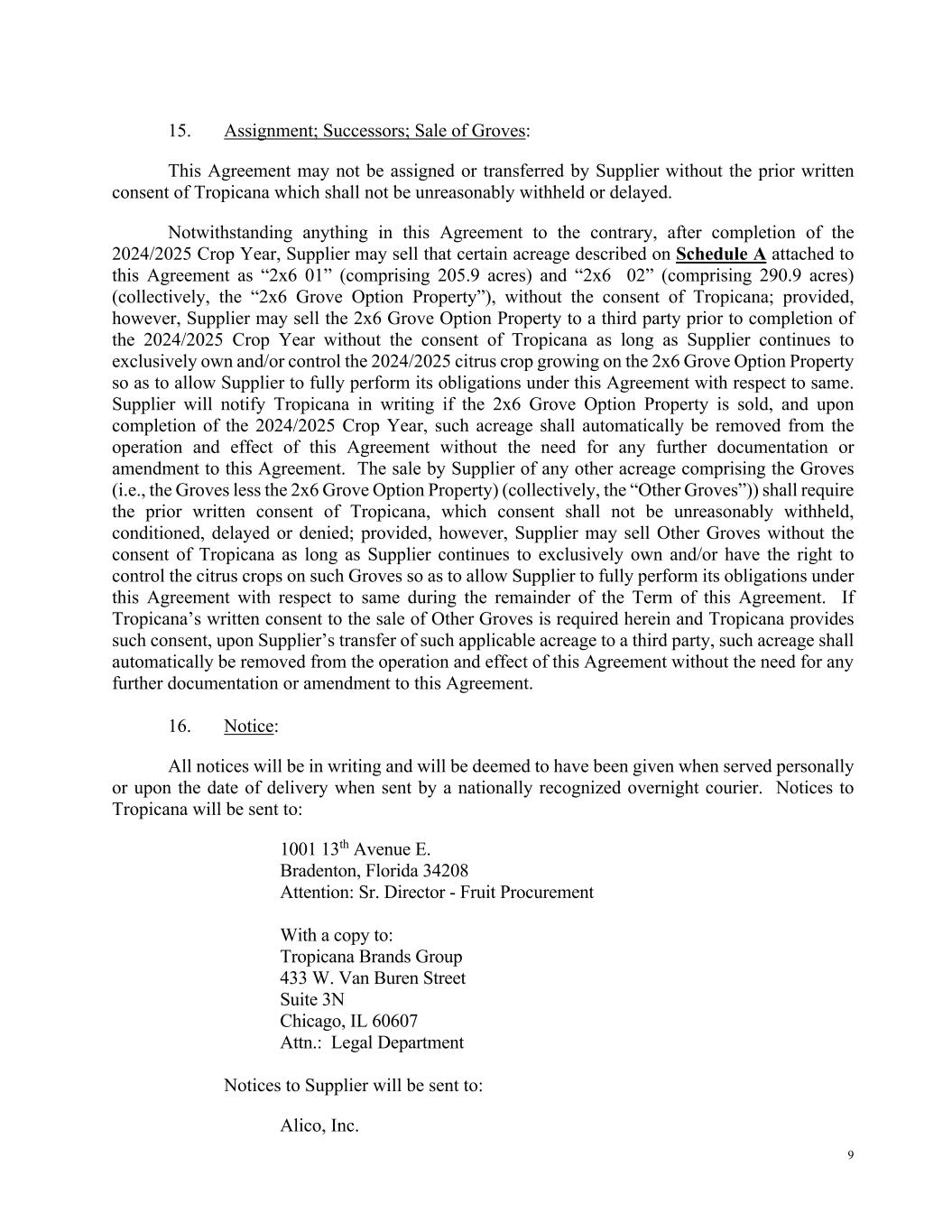 9 15. Assignment; Successors; Sale of Groves: This Agreement may not be assigned or transferred by Supplier without the prior written consent of Tropicana which shall not be unreasonably withheld or delayed. Notwithstanding anything in this Agreement to the contrary, after completion of the 2024/2025 Crop Year, Supplier may sell that certain acreage described on Schedule A attached to this Agreement as “2x6 01” (comprising 205.9 acres) and “2x6 02” (comprising 290.9 acres) (collectively, the “2x6 Grove Option Property”), without the consent of Tropicana; provided, however, Supplier may sell the 2x6 Grove Option Property to a third party prior to completion of the 2024/2025 Crop Year without the consent of Tropicana as long as Supplier continues to exclusively own and/or control the 2024/2025 citrus crop growing on the 2x6 Grove Option Property so as to allow Supplier to fully perform its obligations under this Agreement with respect to same. Supplier will notify Tropicana in writing if the 2x6 Grove Option Property is sold, and upon completion of the 2024/2025 Crop Year, such acreage shall automatically be removed from the operation and effect of this Agreement without the need for any further documentation or amendment to this Agreement. The sale by Supplier of any other acreage comprising the Groves (i.e., the Groves less the 2x6 Grove Option Property) (collectively, the “Other Groves”)) shall require the prior written consent of Tropicana, which consent shall not be unreasonably withheld, conditioned, delayed or denied; provided, however, Supplier may sell Other Groves without the consent of Tropicana as long as Supplier continues to exclusively own and/or have the right to control the citrus crops on such Groves so as to allow Supplier to fully perform its obligations under this Agreement with respect to same during the remainder of the Term of this Agreement. If Tropicana’s written consent to the sale of Other Groves is required herein and Tropicana provides such consent, upon Supplier’s transfer of such applicable acreage to a third party, such acreage shall automatically be removed from the operation and effect of this Agreement without the need for any further documentation or amendment to this Agreement. 16. Notice: All notices will be in writing and will be deemed to have been given when served personally or upon the date of delivery when sent by a nationally recognized overnight courier. Notices to Tropicana will be sent to: 1001 13th Avenue E. Bradenton, Florida 34208 Attention: Sr. Director - Fruit Procurement With a copy to: Tropicana Brands Group 433 W. Van Buren Street Suite 3N Chicago, IL 60607 Attn.: Legal Department Notices to Supplier will be sent to: Alico, Inc.
