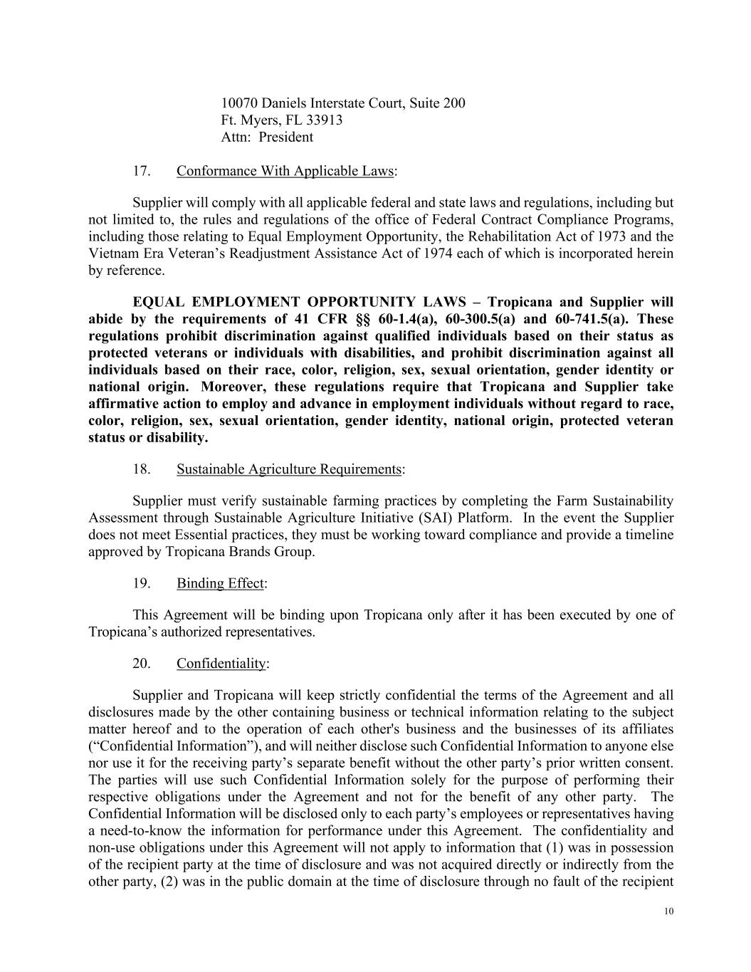 10 10070 Daniels Interstate Court, Suite 200 Ft. Myers, FL 33913 Attn: President 17. Conformance With Applicable Laws: Supplier will comply with all applicable federal and state laws and regulations, including but not limited to, the rules and regulations of the office of Federal Contract Compliance Programs, including those relating to Equal Employment Opportunity, the Rehabilitation Act of 1973 and the Vietnam Era Veteran’s Readjustment Assistance Act of 1974 each of which is incorporated herein by reference. EQUAL EMPLOYMENT OPPORTUNITY LAWS – Tropicana and Supplier will abide by the requirements of 41 CFR §§ 60-1.4(a), 60-300.5(a) and 60-741.5(a). These regulations prohibit discrimination against qualified individuals based on their status as protected veterans or individuals with disabilities, and prohibit discrimination against all individuals based on their race, color, religion, sex, sexual orientation, gender identity or national origin. Moreover, these regulations require that Tropicana and Supplier take affirmative action to employ and advance in employment individuals without regard to race, color, religion, sex, sexual orientation, gender identity, national origin, protected veteran status or disability. 18. Sustainable Agriculture Requirements: Supplier must verify sustainable farming practices by completing the Farm Sustainability Assessment through Sustainable Agriculture Initiative (SAI) Platform. In the event the Supplier does not meet Essential practices, they must be working toward compliance and provide a timeline approved by Tropicana Brands Group. 19. Binding Effect: This Agreement will be binding upon Tropicana only after it has been executed by one of Tropicana’s authorized representatives. 20. Confidentiality: Supplier and Tropicana will keep strictly confidential the terms of the Agreement and all disclosures made by the other containing business or technical information relating to the subject matter hereof and to the operation of each other's business and the businesses of its affiliates (“Confidential Information”), and will neither disclose such Confidential Information to anyone else nor use it for the receiving party’s separate benefit without the other party’s prior written consent. The parties will use such Confidential Information solely for the purpose of performing their respective obligations under the Agreement and not for the benefit of any other party. The Confidential Information will be disclosed only to each party’s employees or representatives having a need-to-know the information for performance under this Agreement. The confidentiality and non-use obligations under this Agreement will not apply to information that (1) was in possession of the recipient party at the time of disclosure and was not acquired directly or indirectly from the other party, (2) was in the public domain at the time of disclosure through no fault of the recipient