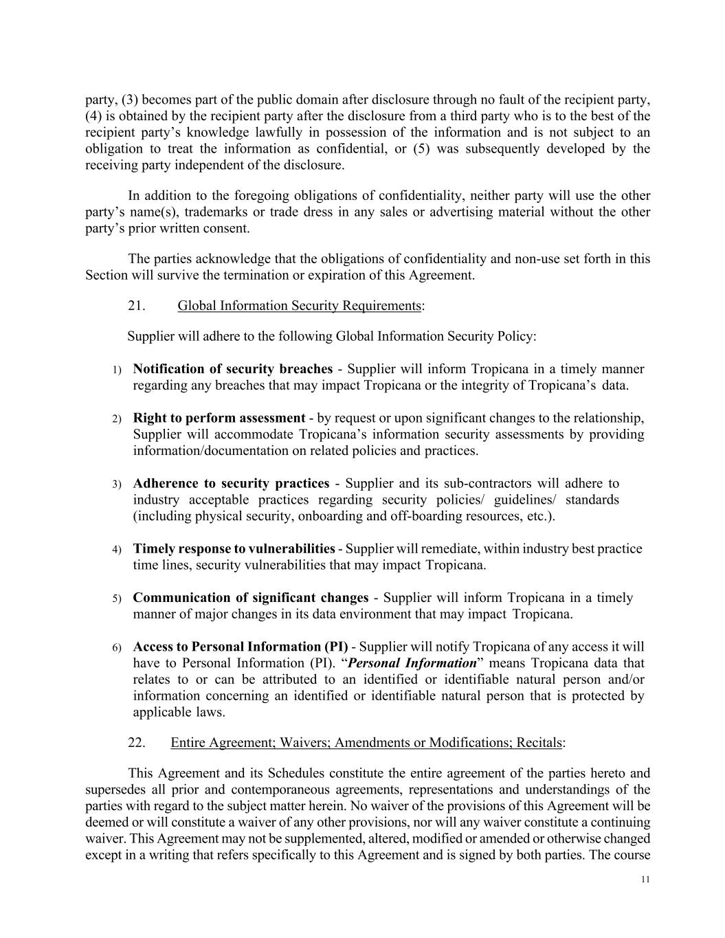 11 party, (3) becomes part of the public domain after disclosure through no fault of the recipient party, (4) is obtained by the recipient party after the disclosure from a third party who is to the best of the recipient party’s knowledge lawfully in possession of the information and is not subject to an obligation to treat the information as confidential, or (5) was subsequently developed by the receiving party independent of the disclosure. In addition to the foregoing obligations of confidentiality, neither party will use the other party’s name(s), trademarks or trade dress in any sales or advertising material without the other party’s prior written consent. The parties acknowledge that the obligations of confidentiality and non-use set forth in this Section will survive the termination or expiration of this Agreement. 21. Global Information Security Requirements: Supplier will adhere to the following Global Information Security Policy: 1) Notification of security breaches - Supplier will inform Tropicana in a timely manner regarding any breaches that may impact Tropicana or the integrity of Tropicana’s data. 2) Right to perform assessment - by request or upon significant changes to the relationship, Supplier will accommodate Tropicana’s information security assessments by providing information/documentation on related policies and practices. 3) Adherence to security practices - Supplier and its sub-contractors will adhere to industry acceptable practices regarding security policies/ guidelines/ standards (including physical security, onboarding and off-boarding resources, etc.). 4) Timely response to vulnerabilities - Supplier will remediate, within industry best practice time lines, security vulnerabilities that may impact Tropicana. 5) Communication of significant changes - Supplier will inform Tropicana in a timely manner of major changes in its data environment that may impact Tropicana. 6) Access to Personal Information (PI) - Supplier will notify Tropicana of any access it will have to Personal Information (PI). “Personal Information” means Tropicana data that relates to or can be attributed to an identified or identifiable natural person and/or information concerning an identified or identifiable natural person that is protected by applicable laws. 22. Entire Agreement; Waivers; Amendments or Modifications; Recitals: This Agreement and its Schedules constitute the entire agreement of the parties hereto and supersedes all prior and contemporaneous agreements, representations and understandings of the parties with regard to the subject matter herein. No waiver of the provisions of this Agreement will be deemed or will constitute a waiver of any other provisions, nor will any waiver constitute a continuing waiver. This Agreement may not be supplemented, altered, modified or amended or otherwise changed except in a writing that refers specifically to this Agreement and is signed by both parties. The course